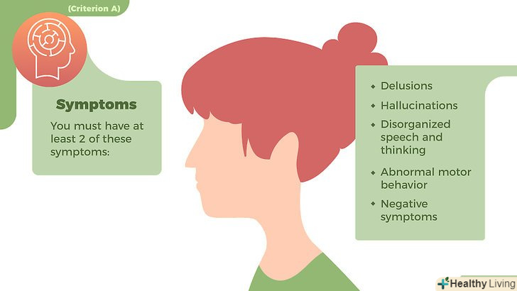 Знайте, які симптоми характерні для шизофренії (критерій А). щоб поставити діагноз, лікар перевірить вас на наявність п'яти категорій симптомів: маревні ідеї, галюцинації, порушення мови і розумового процесу, рухові розлади (включаючи кататонію) і негативні симптоми (симптоми, які відображають дефіцит певних властивостей).[1][2]- У вас повинно бути як мінімум 2 (і більше) з цих симптомів. Кожен повинен проявлятися значний час протягом місяця (і менше, якщо ви отримували лікування). Як мінімум одним з двох обов'язкових симптомів повинні бути маячні ідеї, галюцинації або порушення мови.[3]