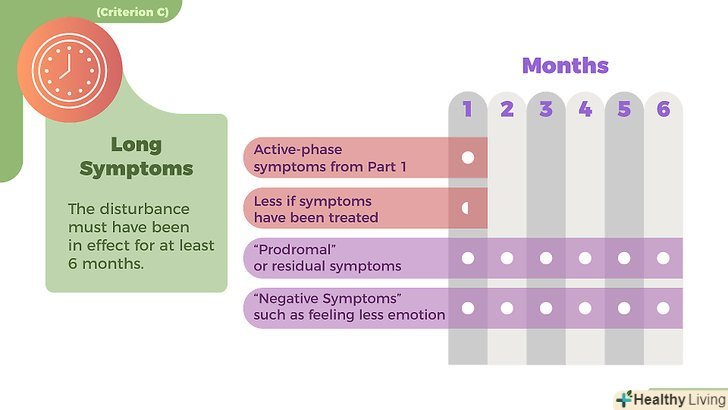 Врахуйте те, як довго у вас спостерігаються симптоми (критерій С). щоб поставити діагноз "шизофренія", психіатр або психотерапевт запитає вас, як довго ви спостерігаєте у себе симптоми і порушення. Для діагнозу "шизофренія" необхідно, щоб порушення спостерігалися не менше 6 місяців.[23]- Цей період повинен включати як мінімум 1 місяць симптомів в активній фазі, описаних у першій частині цієї статті (критерій А), хоча цей період може бути меншим, якщо ви отримували симптомотичне лікування.