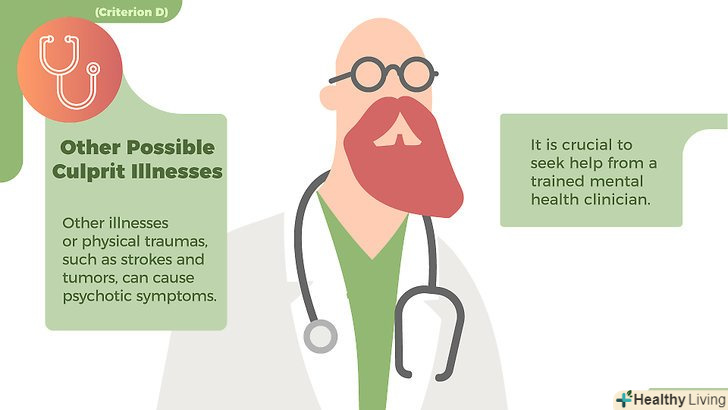 Виключіть інші можливі причини симптомів (критерій D).Шизоаффективний розлад, депресивний розлад або біполярний розлад з психотичними рисами можуть викликати схожі з шизофренією симптоми. Інші захворювання і фізичні розлади (Серцевий Напад, пухлини) можуть провокувати появу психотичних симптомів.[24] тому вкрай важливо звернутися за допомогою до кваліфікованого фахівця. Ви не зможете самі відрізнити одне захворювання від іншого.[25]- Ваш лікар запитає вас, чи були у вас суттєві депресивні або маніакальні епізоди одночасно з проявом симптомів в активній фазі.