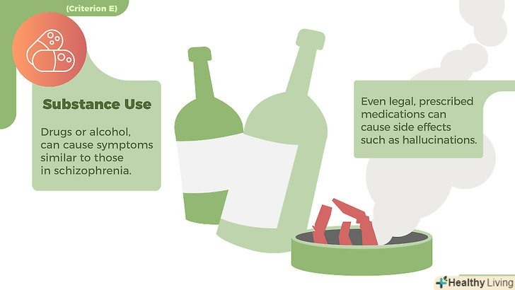 Виключіть наслідки впливу стимулюючих речовин (критерій Е).вживання стимулюючих речовин, у тому числі наркотиків і алкоголю, може викликати симптоми, схожі з симптомами шизофренії. Щоб поставити діагноз, лікар повинен буде переконатися, що порушення і симптоми, які у вас є, не викликані прямим фізіологічним дією речовини (наркотичного або лікарського).[27]- Навіть легальні препарати, виписані лікарем, можуть викликати галюцинації в якості побічного ефекту. Важливо, щоб діагноз ставив фахівець, оскільки він зможе відрізнити побічні ефекти від прийому різних речовин від симптомів захворювання.