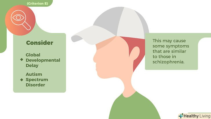 Подумайте, чи можуть симптоми бути пов'язані з загальною затримкою розвитку або розладом аутистичного спектру. Лікарю потрібно буде виключити ці розлади. При загальній затримці розвитку і при розладах аутистичного спектру часто проявляються симптоми, схожі з симптомами шизофренії.[29]- Якщо в історії хвороби людини є розлад аутистичного спектру та інші комунікативні розлади, які почали проявлятися в дитинстві, діагноз «шизофренія» може бути поставлений тільки при наявностіяскраво виражених маячних ідей і галюцинацій.