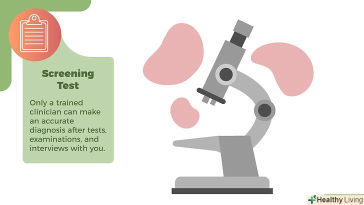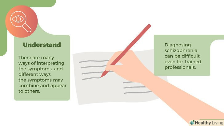 Знайте, що навіть якщо ваш стан відповідає описаним вище критеріям, це не обов'язково означає, що у вас шизофренія.Критерії постановки діагнозу "шизофренія", а також інших психіатричних розладів вважаються політетичними. Це означає, що всі симптоми цих захворювань можна трактувати по-різному, а також те, що симптоми можуть зустрічатися в різних поєднаннях і проявах. Правильно поставити діагноз» шизофренія " буває складно навіть досвідченому лікарю.[30]- Також можливо, як було сказано вище, що симптоми є результатом травми, іншого захворювання або розлади. Важливо звернутися за професійною допомогою, щоб правильно поставити діагноз.