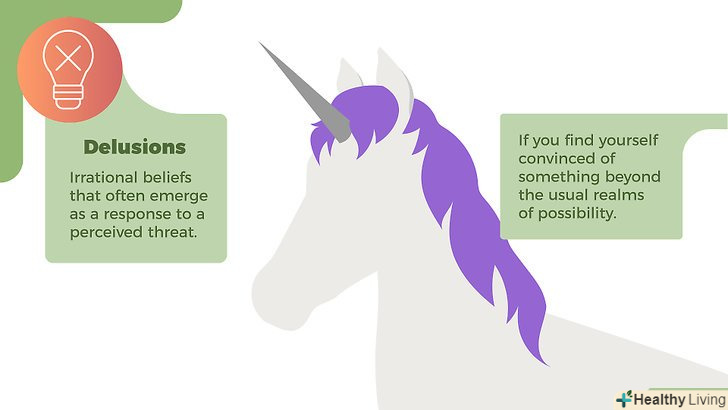 Подумайте, чи бувають у вас маячні ідеї. маячними ідеями вважаються нераціональні переконання, які виникають як реакція на загрозу, яка у великій мірі або повністю не сприймається як загроза іншими людьми. Маячні ідеї не проходять, незважаючи на те, що вони не відповідають дійсності.[4]- Є різниця між маренням і підозрами. У багатьох людей час від часу виникають підозри (наприклад, що колега хоче підставити або що в житті настала чорна смуга). Різниця полягає в тому, чи викликають у вас ці підозри сильний стрес і заважають вони вам вести звичний спосіб життя.