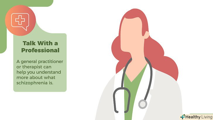 Поговоріть з фахівцем.якщо ви боїтеся, що у вас може бути шизофренія, поговоріть з терапевтом або психотерапевтом. Хоча у терапевта або психотерапевта може не бути потрібних навичок і знань для діагностики цього захворювання, ці фахівці можуть пояснити вам, що таке шизофренія, і допоможуть вирішити, чи потрібно вам звернутися до психіатра.[35]- Терапевт також зможе виключити інші причини симптомів, включаючи травми і захворювання.