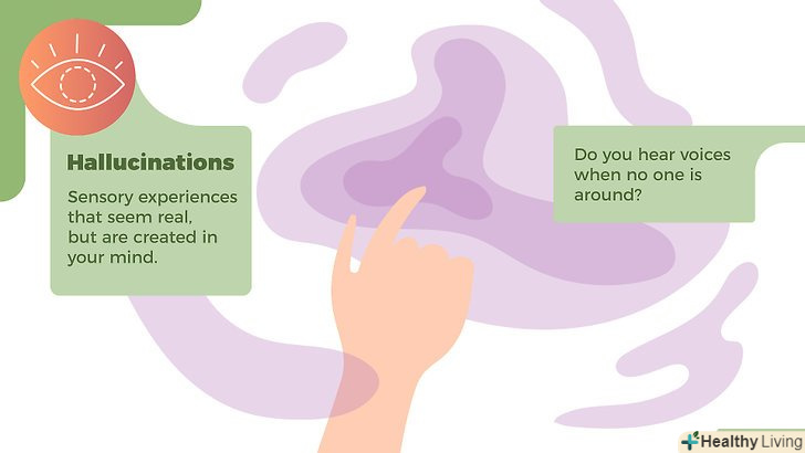 Подумайте, чи бувають у вас галюцинації. галюцинації - це відчуття, які здаються реальними, але насправді існують тільки в уяві людини.[6] галюцинації можуть бути слуховими (те, що ви чуєте), візуальними (те, що ви бачите), нюховими (запахи), тактильними (відчуття на шкірі — наприклад, людині може здаватися, що по ньому повзуть комахи). У людини можуть виникати будь-які з перерахованих галюцинацій.[7]- Подумайте, чи бувають у вас відчуття, немов по вас повзають комахи, і якщо так, як часто. Чи чуєте ви голоси, коли навколо нікого немає? Чи бачите ви те, чого немає, або те, чого не бачать інші?