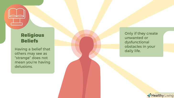 Подумайте про свої релігійні переконання та культурні норми.якщо ви вірите в те, що іншим здається дивним, це не означає, що у вас маячні ідеї. І навіть якщо ви бачите те, чого не бачать інші, ці бачення можуть і не бути небезпечними галюцинаціями. Переконання вважаються маревними або небезпечними тільки в рамках певних культурних і релігійних норм. Переконання та бачення зазвичай визнаються ознаками психозу або шизофренії, якщо вони створюють небажані або шкідливі перешкоди в повсякденному житті.- Наприклад, віра в те, що за погані вчинки доведеться розплачуватися, в одних культурах вважається маячною, а в інших — абсолютно нормальною.[8]