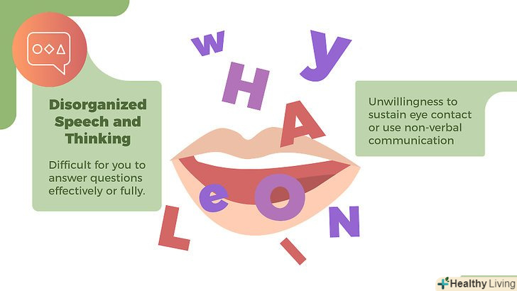 Подумайте, чи не розвинулися у вас порушення мови і розумового процесу. порушення мови і розумового процесу виражаються в тому, що людина відчуває труднощі з повним або задовільним відповіддю на питання. Відповіді можуть бути не пов'язаними з питанням, можуть бути уривчастими і неповними. У багатьох випадках порушення мови поєднуються з нездатністю або небажанням підтримувати зоровий контакт і користуватися жестами та іншими формами мови тіла.[12] можливо, для оцінки своєї мовної поведінки вам буде потрібна допомога інших.- У найважчих випадках мова може бути схожою на "словесний вінегрет": людина вимовляє набір слів або фраз, які не пов'язані між собою і не можуть бути зрозумілі слухачем.[13]