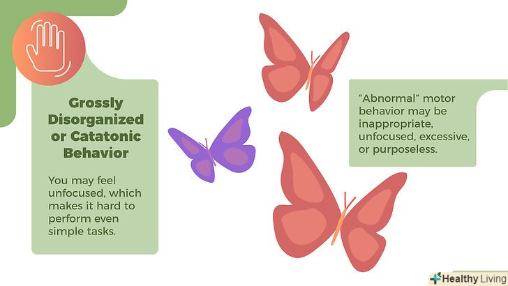 Знайте, як проявляються порушення в поведінці і кататонія. порушення в поведінці і кататонія можуть проявлятися по-різному. Це можуть бути труднощі з концентрацією уваги, через які людині складно виконувати навіть прості завдання на зразок миття рук. Людина може хвилюватися, відчувати себе нерозумно або вести себе захоплено з непередбачуваних причин. Руховими розладами вважаються недоречні, ненаправлені, надмірні або безцільні руху. Наприклад, людина може безладно розмахувати руками або приймати дивні пози.[16][17]- Кататонія-це ще одна форма порушень рухової поведінки. У важких випадках шизофренії людина може не рухатися і не видавати звуків протягом багатьох днів. У таких ситуаціях люди не реагують на зовнішні стимули (розмови) і навіть на фізичні впливи (дотики).[18]