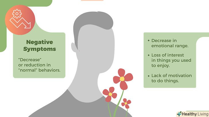 Подумайте, чи втратили ви здатність вести нормальний спосіб життя. негативні симптоми - це симптоми, які демонструють погіршення в звичайній поведінці або зниження функціональності. Наприклад, скорочення спектру емоцій або виразів буде вважатися негативним симптомом. До негативних симптомів також відноситься втрата інтересу до речей, які доставляли вам задоволення, і відсутність мотивації займатися чим-небудь.[19]- Негативні симптоми можуть бути і когнітивними-наприклад, проблеми з концентрацією. Негативні когнітивні симптоми зазвичай більш руйнівно впливають на людину і помітні оточуючим більше в порівнянні з неуважністю або порушеннями концентрації, які часто бувають у людей з синдромом дефіциту уваги і гіперактивності.[20]