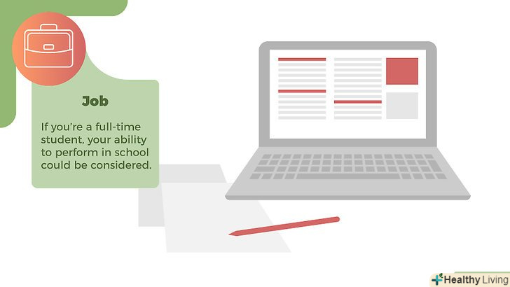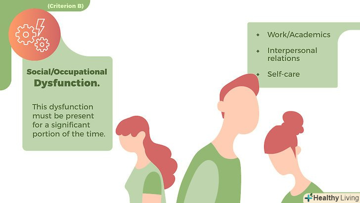 Подумайте, чи можна вважати Ваше соціальне і робоче життя нормальним (критерій B).другим критерієм при постановці діагнозу "шизофренія" є дисфункція соціального і робочого життя. Ця дисфункція повинна спостерігатися тривалий час після появи симптомів. Багато захворювань можуть викликати порушення в робочому і соціальному житті, і навіть якщо у вас є проблеми в одній або декількох сферах, це може не означати, що у вас шизофренія. Для постановки діагнозу повинні спостерігатися серйозні порушення в одній або декількох сферах з перерахованих нижче:[21]- Робота / навчання;