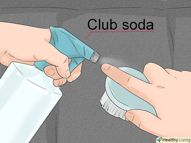 Використовуйте газовану воду.газовану воду можна використовувати для виведення плям на тканинних сидіннях. Розпиліть тонкий шар газованої води на пляму і протріть його щіткою. Якщо потрібно, повторіть всю процедуру знову, не забуваючи витирати надлишок води.[10]- Газована вода прекрасно підходить для виведення плям від блювоти.
