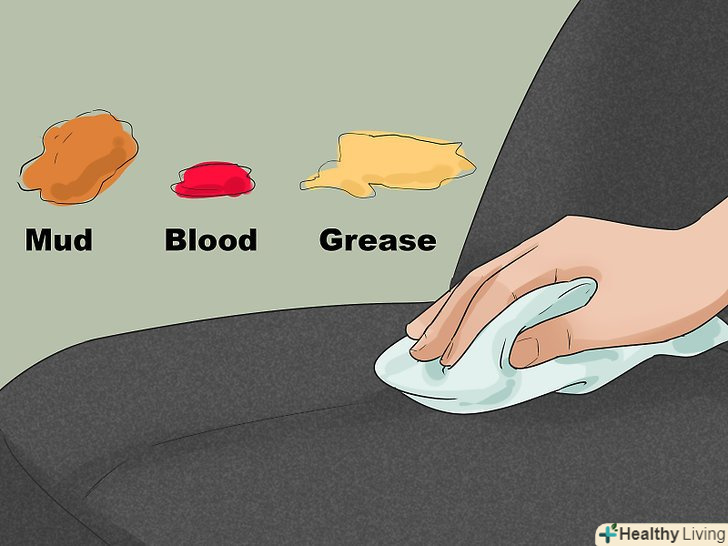 Витирайте розливи і плями відразу, як тільки ті з'являться.якщо ви хочете уникнути плям на тканинній оббивці сидінь, витирайте будь-які розливи, як тільки вони виникнуть. Це також стосується і інших речей, які тут же залишають плями, на зразок бруду, крові і жиру.- Якщо ви щось розлили, негайно просочіть пляму рушником або ганчіркою.