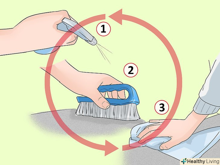 Повторюйте, поки не приберете весь бруд.продовжуйте розпилювати, протирати і витирати, поки не видалите весь бруд. Пам'ятайте, що головне — не насичувати тканину розчином, а лише нанести тонкий шар миючого засобу перед очищенням. Для повного видалення плям вам доведеться розпорошити засіб від трьох до шести разів.[5]