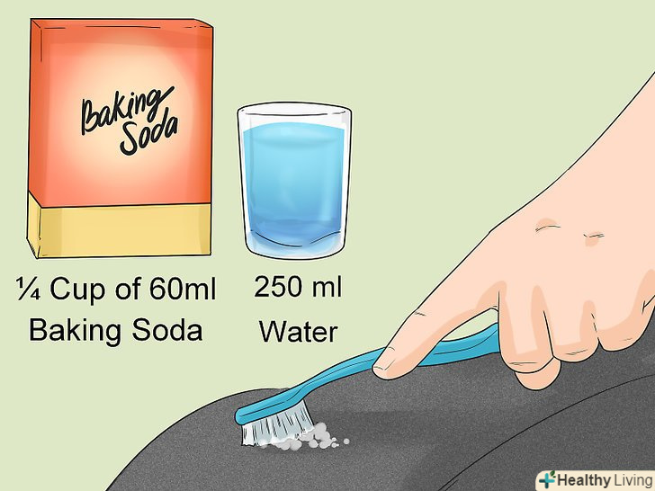 Приготуйте розчин з харчової соди.харчова сода може бути використана в якості очищувача для видалення неприємного запаху з тканинної оббивки сидінь. Розведіть 60 г харчової соди в 250 мл теплої води. Нанесіть на сидіння тонкий шар розчину. Протріть пляму зубною щіткою.[9]- Використовуйте цей метод для видалення важкодоступних плям. Залиште розчин на 30 хвилин, щоб видалити складні плями з тканини. Через півгодини протріть пляму чистим рушником.