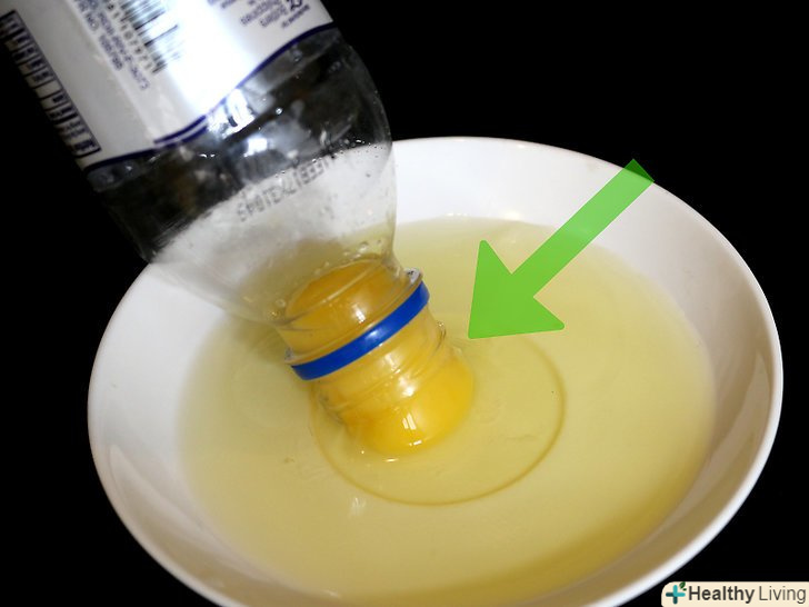 Скористайтеся пляшкою від води.останнім часом помітно набирає популярність метод з використанням пластикової пляшки від води, за допомогою якої можна втягнути жовток, відокремивши його від білка. На цей раз потрібно розбити яйце і вилити вміст в миску. Щоб жовток легше втягнувся в пляшку, потрібно злегка змочити її шийку водою. Після трохи стисніть пляшку, наведіть її шийку прямо на жовток, а потім розтисніть пляшку. Таким чином жовток повинен втягнутися прямо в пляшку.[1]- Викиньте жовток, промийте пляшку і повторіть процедуру з іншими яйцями.