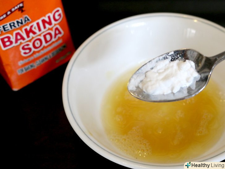 Додайте харчову соду (бажано).її можна без побоювання комбінувати з іншими додатковими інгредієнтами. Харчова сода корисна для шкіри з кількох причин. По-перше, сода робить маску пастоподібною, що дозволяє очистити і відлущити шкіру. По-друге, сода може допомогти відновити pH шкіри, порушення якого і є причиною виникнення акне. І нарешті, харчова сода дозволяє підсушити шкіру, знищити патогенну мікрофлору і позбутися від акне. Спробуйте додати одну столову ложку харчової соди. Поступово ця кількість можна збільшувати, якщо ви помітили хороший результат, а також якщо це не шкодить вашій шкірі.- Щоб знайти більше інформації про те, як використовувати питну соду для лікування акне, прочитайте цюстаттю.