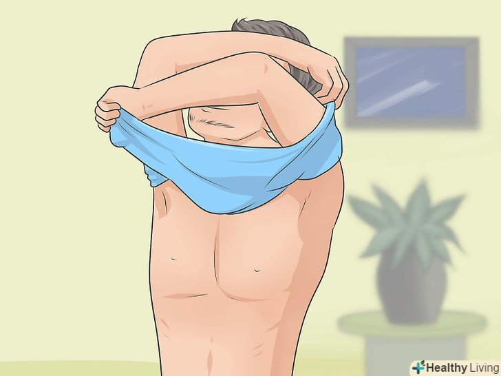 Ослабте або зніміть вологий, щільно прилеглий одяг.ділянку шкіри, на якому з'явилася пітниця, потрібно відкрити, щоб він висох на повітрі. Оскільки пітниця найчастіше виникає в результаті закупорювання потових залоз, важливо зупинити цей процес і дозволити шкірі вільно дихати.- Не потрібно витирати шкіру рушником-повітря буде достатньо.[4]