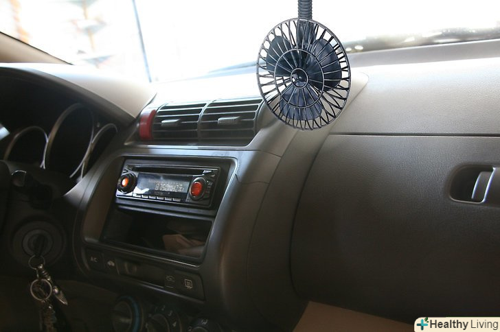 Поставте на приладову панель вентилятор (може бути протизаконно в деяких країнах, вивчіть законодавство) або повісьте його на козирок.у магазинах автозапчастин сьогодні можна знайти цілий ряд недорогих 12-вольтних вентиляторів. Вони кріпляться на козирок або дзеркало заднього виду або встановлюються на панель приладів і працюють від прикурювача. Увімкніть вентилятор в момент руху, щоб повітря циркулював по салону, так, ви будете почувати себе прохолодніше.- Пасажири можуть використовувати паперовий або справжній вентилятор, щоб повітря циркулювало навколо них. Якщо рухи відволікають вас під час їзди, попросіть пасажирів зменшити швидкість вентилятора або вимкнути його.