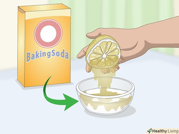 Змішайте соду з лимонним соком, щоб приготувати натуральну освітлюючу пасту.візьміть миску і змішайте в ній рівні частини соди і лимонного соку, після чого перемішайте до утворення пасти. Руками втирайте пасту в коліна протягом хвилини, після чого змийте її водою.[3]- Соду і лимонний сік часто використовують в якості освітлюючих засобів, до того ж зернистість соди допоможе відлущити шкіру. Згодом вони зроблять шкіру більш світлою.