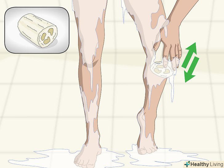 Відлущіть коліна мочалкою з люфи або жорсткою губкою.якщо ви не хочете готувати скраб, використовуйте ручний засіб для відлущування (на зразок мочалки з люфи або губки) і видаліть їм омертвілі клітини шкіри. Купіть мочалку в супермаркеті або магазині косметики і мийтеся нею в душі, розтираючи кожне коліно не менше 30 секунд.[7]- Фізичне відлущування за допомогою мочалки з люфи, губки або м'якої пемзи часто застосовують для лікування симптомів псоріазу та інших захворювань, що викликають сухість шкіри.