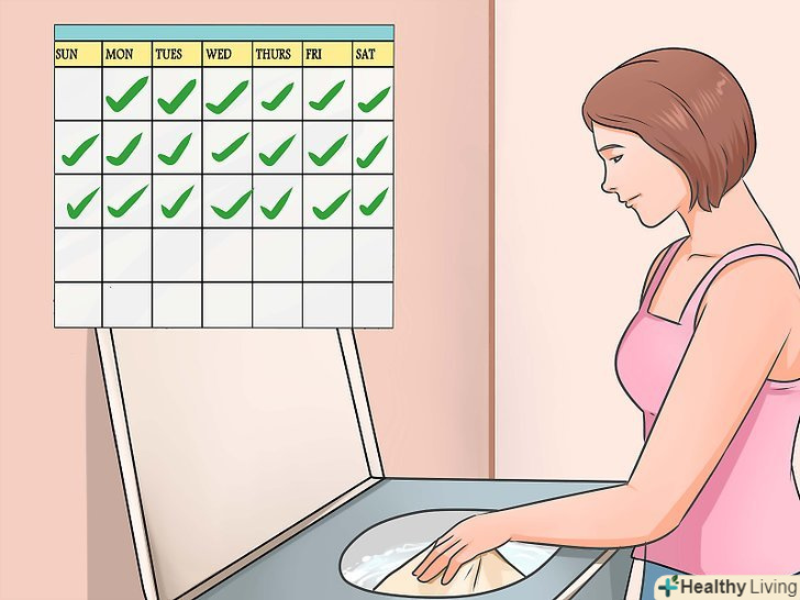 Нанесіть крем або лосьйон.спочатку нанесіть його позаду вух і на підборідді, а потім просувайтеся повільно вниз. Наносите його за допомогою ватного тампона, пензлика, губки або будь-якого предмета, який продається разом з цим засобом.- Продовжуйте втирати крем по всьому тілу.[15] не пропускайте жодної частини свого тіла. Постарайтеся нанести його на геніталії, підошви стоп, між пальцями, на спину і сідниці. Попросіть кого-небудь допомогти нанести його на ті ділянки, до яких ви не можете дотягнутися самі.