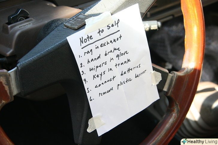 Залиште для себе записку на рульовому колесі, в якій вкажіть всі виконані необов'язкові дії (ганчір'я в отворах забору і випуску повітря, зняті килимки і акумулятор). перед повторним використанням автомобіля виконайте всі ці дії в зворотній послідовності, звіряючись зі списком. кожен пункт списку слід вказувати окремо; запис на кшталт "дрантя в отворах" може привести до того, що ви забудете, в яких саме.