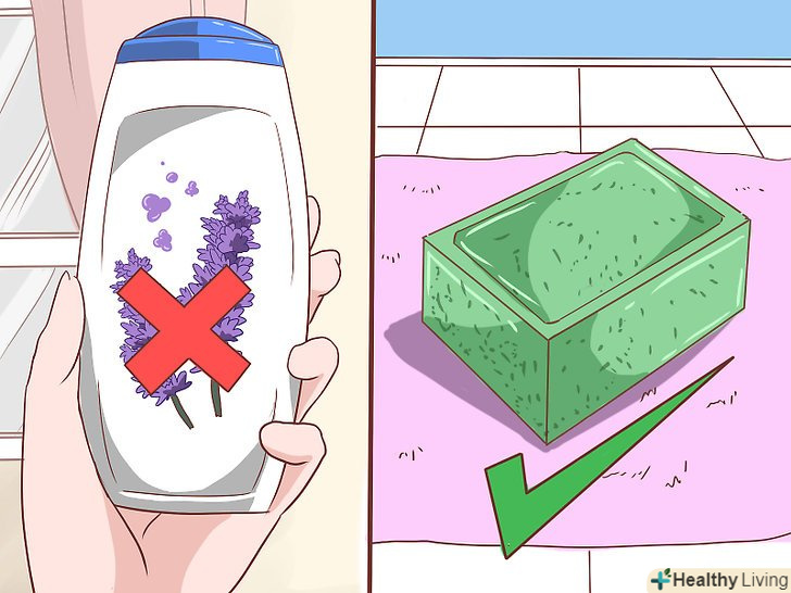 Уникайте застосування ароматизованих засобів особистої гігієни.Уникайте використання духів, мила, лосьйонів, шампунів і будь-яких інших засобів особистої гігієни або товарів краси з ароматичними ароматами і хімічними компонентами. У багатьох людей ці продукти призводять до подразнення шкіри і посилення симптомів свербіння.[41]- Користуйтеся щадним милом з гліцерином, його зазвичай можна знайти в аптеках або супермаркетах. Серед поширених марок гліцеринового мила слід назвати Ecolab, Dalan,» миловарів «і»Дракошу". Гліцеринове мило не дратує і не сушить шкіру. Гліцерин-нетоксичний, безбарвний гель без запаху, який використовувався століттями для зволоження і очищення шкіри.[42]