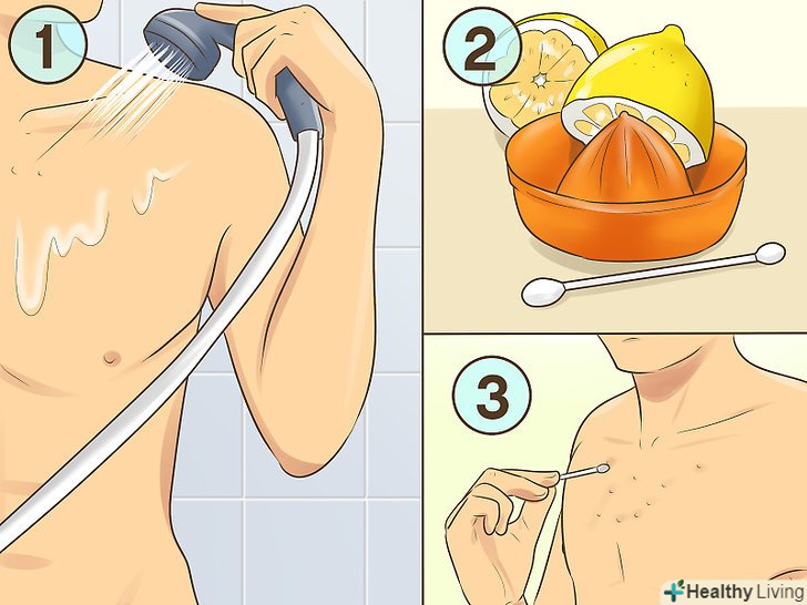 - Мийте шкіру на грудях засобом, що містить бензоїлу пероксид.такі засоби спрямовані на лікування наявного акне і допомагають слідам від акне гоїтися швидше. Приймаючи душ або ванну, нанесіть засіб на груди і вспеньте. Потім змийте водою.[15]