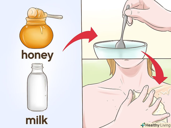 Спробуйте обробити виступаючі шрами натуральним скрабом.якщо у вас невеликі виступаючі шрами, вам може підійти натуральний скраб, який замінить вам дермабразію. Спробуйте час від часу наносити на шкіру наступні засоби для освітлення і розгладження шрамів:[20]- Змішайте трохи меду і молока до стану пасти. Нанесіть на шрам, залиште на кілька хвилин, потім змийте в душі чистою і м'якою тканиною.