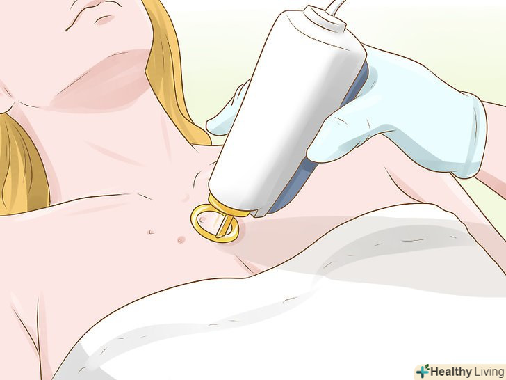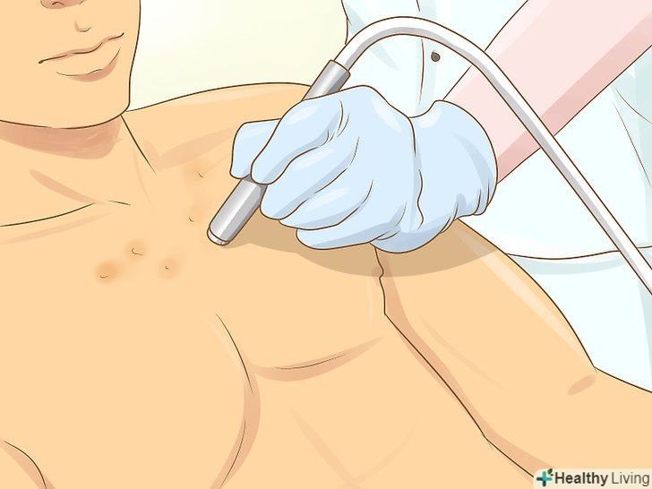 Спробуйте лікувати шрами лазером, якщо лікар порекомендує вам це.лікування лазером та іншими видами випромінювання може поліпшити вигляд шкіри. Найефективніше процедура видаляє тонкі шрами, виступаючі шрами видалити лазером складніше.[11] однак лазерна терапія здатна поступово розм'якшувати рубці, завдяки чому вони будуть ставати менш помітними.[12] є кілька різних апаратів для лікування лазером, і терміни відновлення після процедур у всіх різні. Попросіть лікаря розповісти про процедуру докладніше.[13]- Лікування лазером може називатися по-різному: лазерне шліфування, лазерна вапоризація, лазерне видалення рубців. васкулярний лазер здатний зменшувати почервоніння шрамів, впливаючи на кровоносні судини в рубцях.[14]