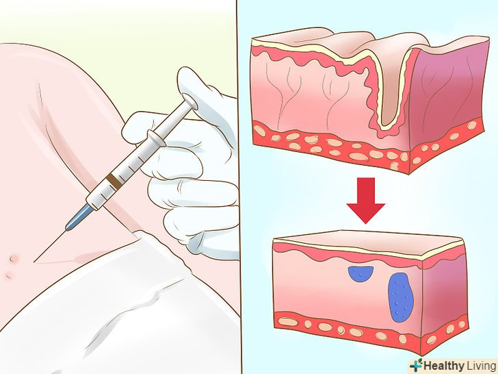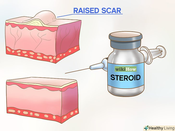 Якщо шрами виступають над поверхнею шкіри, спробуйте ін'єкції стероїдів.від акне часто залишаються виступаючі, червоні, горбисті рубці — їх називають келлоіднимі. Запитайте лікаря про ін'єкції кортикостероїдів, які допоможуть зупинити запальний процес і поступово зробити шрами малопомітними.[7] залежно від стану шрамів може знадобитися 2-4 курси лікування з перервами в кілька тижнів.