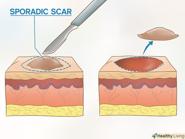 Видаліть поодинокі шрами хірургічним способом.якщо у вас всього кілька шрамів, їх можна видалити хірургічно. Лікар зробить надріз, видалить рубець, а потім зашиє рану або пересадить клапоть шкіри.[10] як і у випадку з усіма хірургічними процедурами, існує ризик занесення інфекції та інших ускладнень. Якщо шрамів багато і вони покривають велику площу шкіри, ця процедура не підійде вам.