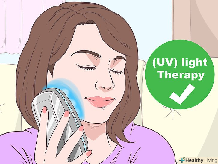 Спробуйте ультрафіолетову (УФ) терапію.якщо екзема не піддається лікуванню, проконсультуйтеся з лікарем або дерматологом про проходження фототерапії. Дослідження показують, що УФ-випромінювання може полегшити свербіж в найкоротші терміни, але для цього вам доведеться проходити по 2-6 процедур в тиждень, протягом від 4 тижнів до 3 місяців.[13]- Кожна процедура триває всього кілька хвилин.