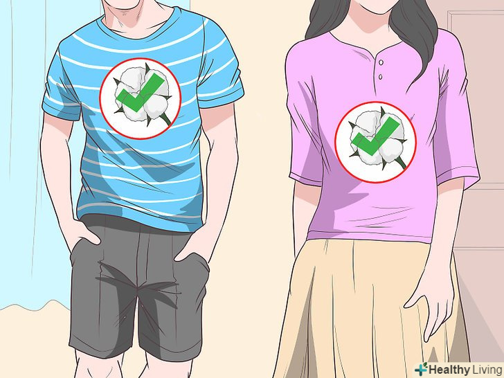 Носіть м'які,» дихаючі " тканини.облягаючий одяг може утримувати тепло і вологу, тим самим загострюючи екзему. Віддайте перевагу вільної дихаючої одязі, наприклад, з бавовни. Тканина повинна бути м'якою і приємною на дотик, і намагайтеся не носити колючі тканини, наприклад, з вовни. Не забувайте, що одяг потрібно прати миючим засобом без запаху. [6]- Якщо ви чешіться уві сні, подумайте про те, щоб, лягаючи спати, надягати легкі зручні рукавички.