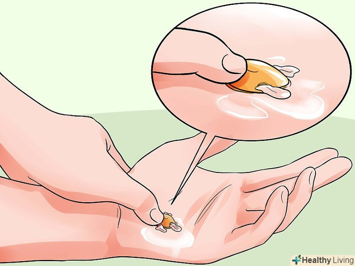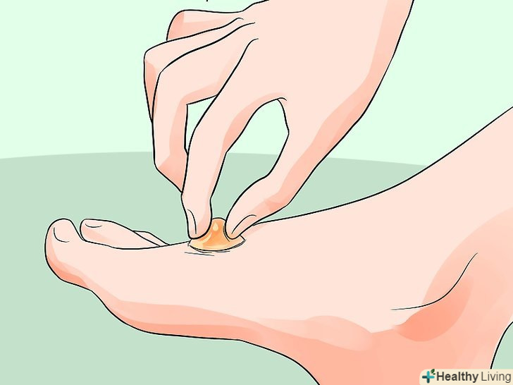 Дренуйте рідину.Дайте вмісту пухиря витекти природним чином під дією гравітації або злегка натисніть на нього в ту сторону, де був зроблений прокол, щоб з отвору витекла вся рідина.[12]- Не тисніть занадто сильно і не розривайте пухир, щоб рідина витекла швидше, інакше ви нашкодите шкірі.