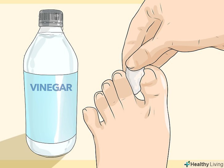 Розгляньте можливість використання оцту.Промочіть ватний тампон в оцті і прикладіть його до мозолі. Залиште замочений тампон на ніч. Вранці протріть мозоль пемзою.[1]- Прилаштовуйте тампон з оцтом тільки до самої мозолі. В іншому випадку ви можете подражнити шкіру навколо неї.