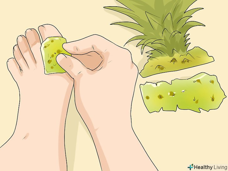 Прикладіть до мозолі ананас.Ананасова шкірка містить певний ензим, який допомагає пом'якшити мозоль і видалити її з шкіри. Прикладіть невеликий шматочок ананасової шкірки на мозоль, і оберніть його чистою тканиною. Робіть так щоночі протягом тижня. Ви також можете нанести на мозоль ананасовий сік.[3]