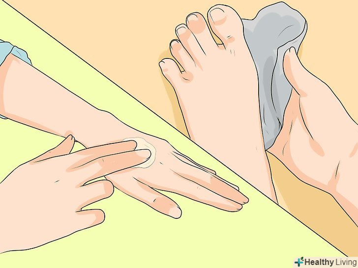 Скористайтеся кукурудзяним крохмалем.посипте кукурудзяний крохмаль між пальцями ніг, щоб зберегти їх в сухості і захистити шкіру від руйнування. Волога не тільки призведе до погіршення стану вашої мозолі, але також може викликати грибкову інфекцію.[1]- Це більше профілактичний засіб і застосовується для усунення дискомфорту.