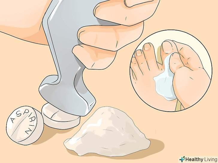 Пом'якшіть мозолі аспірином.візьміть шість розчавлених таблеток аспірину, пів чайної ложки лимонного соку і змішайте їх з водою. Отриману пасту нанесіть на пошкоджену зону, загорніть її в теплий рушник і накрийте поліетиленовим пакетом. Залиште так на 10 хвилин. Зітріть мозолі пемзою.- Не користуйтеся цим методом, якщо ви діабетик або якщо у вас алергія на аспірин.[1]