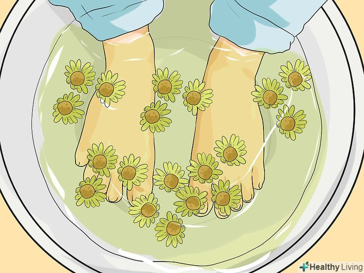 Додайте ромашкового чаю.замочуючи свої ноги в неміцному ромашковому чаї, ви можете пом'якшити і тимчасово змінити рівень pH, тим самим допомагаючи висихати пітним ногам. Чай може забруднити ваші ноги, але ця проблема легко вирішується милом і водою.[1]