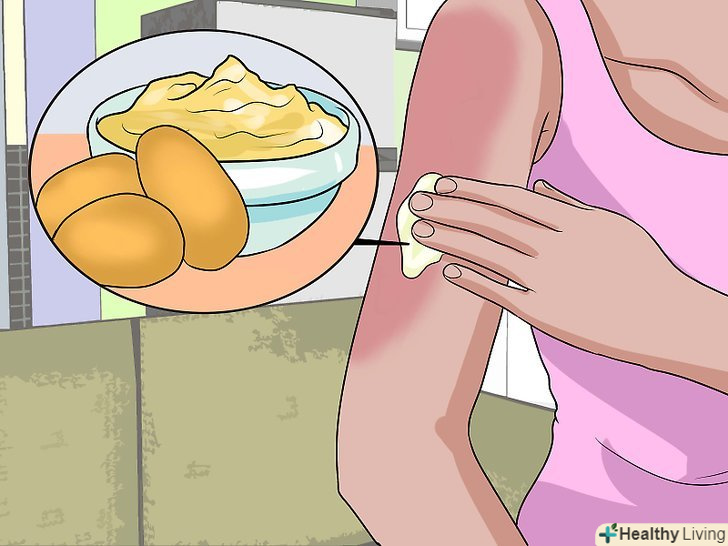 Щоб охолодити обпалену шкіру, нанесіть на неї картоплю.сиру картоплю охолоджує пошкоджену шкіру, споживаючи багато тепла. Завдяки цьому проходить біль, і ранки заживають набагато швидше.[20]- Щоб зробити пасту, почистіть, дрібно поріжте і пам'ятайте сиру картоплю. Нанесіть пасту безпосередньо на пухирі. Залиште на якийсь час, поки паста не висохне, а потім акуратно змийте холодною водою.