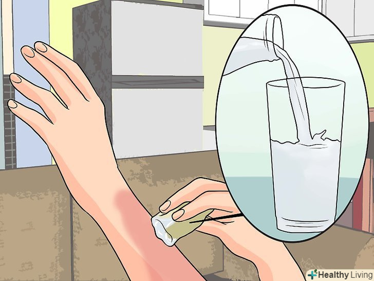 Щоб охолодити роздратовану ділянку шкіри, прикладіть до нього холодний компрес.компрес з холодною водою або чимось іншим допоможе зменшити запалення, тому що під впливом холоду звужуються кровоносні судини, зменшується кровотік в ураженій області.[23]- Холод також «заморожує " нервові закінчення, гальмуючи проведення больових імпульсів і відчуття печіння від місця сонячного опіку і пухирів.
