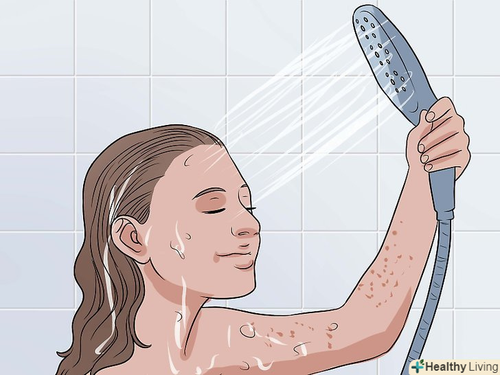 Приймайте душ в теплій воді.температура води в душі або ванній, де ви миєтеся, повинна бути нижче, ніж зазвичай. Зверніть увагу на потужність потоку води. Потік води повинен бути дуже м'яким, щоб не пошкодити шкіру ще більше.[24]- Загалом, Якщо ви якийсь час можете протриматися без душу, краще так і зробити. Під потужністю потоку води пухирі на місці опіку можуть випадково лопнути, що призведе до болю, занесення інфекції і шрамів в подальшому.