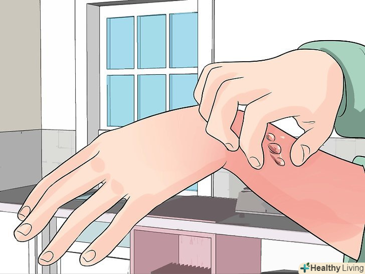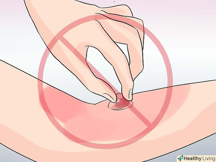 Не чіпайте пошкоджену зону.не намагайтеся проколювати пухирі. Пухирі можуть з часом лопнути самі, але ні в якому разі не можна їх змушувати їх лопатися завчасно, тому що є ризик занесення в ранку інфекції, яка з часом проникне в глибокі шари шкіри. Якщо пухир лопнув сам, покрийте утворилася ранку бинтом, щоб запобігти потраплянню інфекції. Якщо вам здається, що Ви занесли в ранку інфекцію, зверніться до дерматолога. Ось кілька ознак, які можуть вказувати на занесення інфекції: почервоніння, набряклість ранки, біль і жар.[4][5]- Не здирайте шкіру на місці опіку. Досить часто шкіра на місці опіку починає лущитися невеликими пластами, але не здирайте ці пласти. Пам'ятайте, що ця область дуже сприйнятлива до інфекцій і подальшого пошкодження. Так що забудьте про цю ідею.