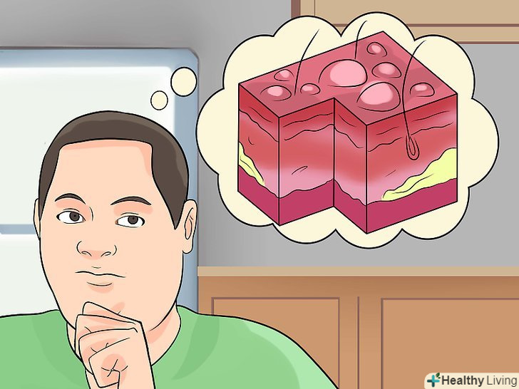 Тепер важливо зрозуміти, яким чином на шкірі з'являються пухирі.вони з'являються не відразу після тривалого перебування на сонці. Пухирі від опіку можуть утворитися через пару днів. Справа в тому, що пухир утворюється через те, що кровоносні судини шкіри пошкоджуються, через що плазма та інші рідини починають просочуватися між шарами шкіри, в результаті чого ця рідина накопичується в отриманому «кишені». Не варто думати, що пухирі не мають відношення до сонячного опіку тільки через те, що вони з'явилися через пару днів. Для світлої шкіри УФ промені набагато небезпечніше, ніж для темної, так що ваша сприйнятливість до засмаги і ризик отримати сонячний опік безпосередньо залежить від вашого типу шкіри.[28]- Опіки першого ступеня являють собою еритему-почервоніння шкіри через розширення кровоносних судин. При опіку першого ступеня пошкоджується тільки верхній шар шкіри. Проте, пошкоджені клітини здатні виділяти спеціальні хімічні речовини-медіатори, які можуть надавати подразнюючу дію на шкіру і руйнувати інші пошкоджені клітини.