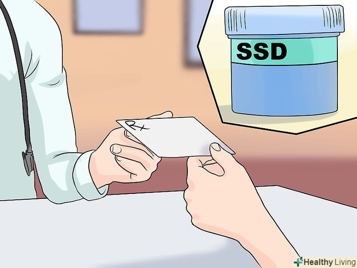 Попросіть лікаря призначити вам 1% крем сульфадіазину срібла.цей препарат є сильним антисептиком-хімічною речовиною, яка використовується для лікування опіків другого і третього ступеня. Зазвичай цей крем наносять на місце опіку два рази в день. Використовуйте його рівно стільки, скільки пропише лікар.[11]- Майте на увазі, що у цього препарату є свої побічні ефекти, деякі з них досить серйозні, хоча зустрічаються відносно рідко. Побічні ефекти можуть включати в себе біль, свербіж, печіння в місці опіку. Шкіра і слизові оболонки (наприклад, ясна) можуть придбати сіруватий відтінок. Обов'язково дізнайтеся у лікаря про побічні ефекти і негайно припиніть використання цього препарату, якщо виникне якийсь побічний ефект.[12]