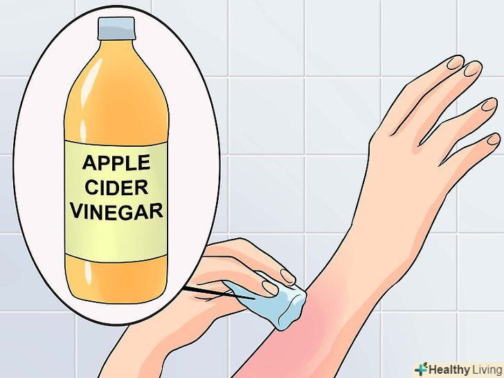 Спробуйте яблучний оцет.яблучний оцет може допомогти при лікуванні опіків і пухирів, він поглинає зі шкіри тепло, знімаючи печіння і біль. Оцтова кислота і яблучна кислота в оцті можуть нейтралізувати опік і відновити рівень pH (кислотності середовища) в ураженій області. Таким чином, вони запобігають розвитку інфекції, створюючи несприятливі умови для життя мікроорганізмів.[17]- Щоб нанести на пошкоджене місце оцет, змішайте оцет з холодною водою і змочіть розчином тканину. Потім оберніть цією тканиною місце опіку. Оцет можна також нанести безпосередньо на уражену ділянку.