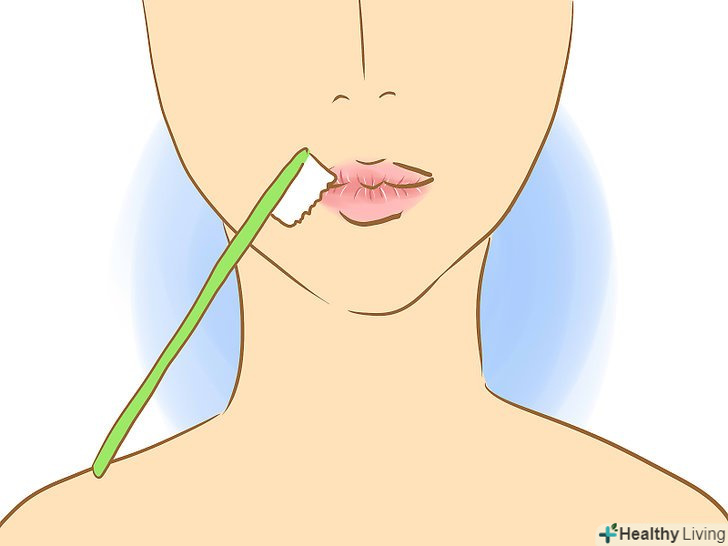 Масажуйте губи зубною щіткою.змочіть губи теплою водою, а потім з допомогу чистої зубної щітки масажуйте їх круговими рухами. Це видалить накопичилася суху, омертвілу шкіру, яка призводить до того, що губи відшаровуються і стають потрісканими. У той час як при покусуванні губ часто знімається занадто багато шкіри, що в результаті призводить до кровотечі, масаж зубною щіткою знімає тільки верхній шар омертвілої шкіри і не зачіпає захисний шар губ.- Чиста мочалка-ще один хороший варіант для масажу губ. Але обов'язково використовуйте нову мочалку, так як в старій можуть жити бактерії.