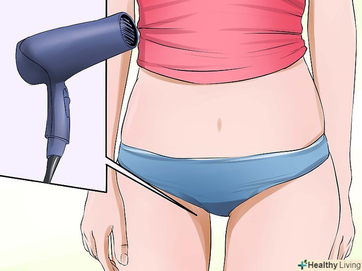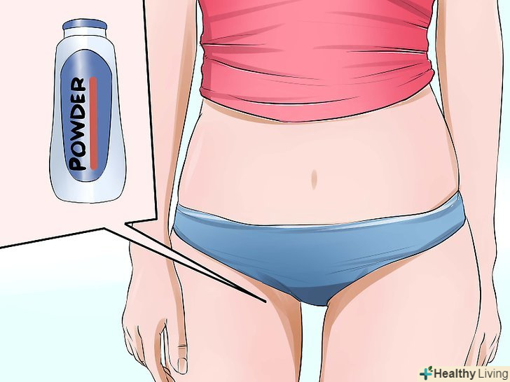 Нанесіть на шкіру присипку.коли шкіра суха і чиста, можете нанести на уражену ділянку присипку, щоб він залишався сухим. Віддавайте перевагу присипок без запаху, найкраще підійде дитяча присипка, але обов'язково перевірте, чи не містить вона тальк (допустимо використовувати тальк тільки в дуже малих кількостях). Якщо ж вам не вдалося знайти присипку без тальку, то наносите її в дуже малих кількостях. Деякі дослідження показали, що тальк підвищує ризик розвитку раку яєчників у жінок.[7]- Не застосовуйте кукурудзяний крохмаль, оскільки він створює хороше середовище для росту грибків та бактерій, що може призвести до розвитку шкірних інфекцій.[8]