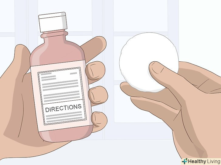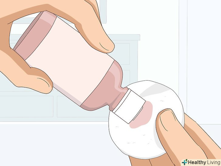 Нанесіть лосьйон на ватний диск.накрийте отвір пляшки ватним тампоном, а потім нахиліть пляшку так, щоб рідина потрапила на диск. Зробіть так кілька разів, поки подушечка не стане вологою, але не просоченої наскрізь.[2]
